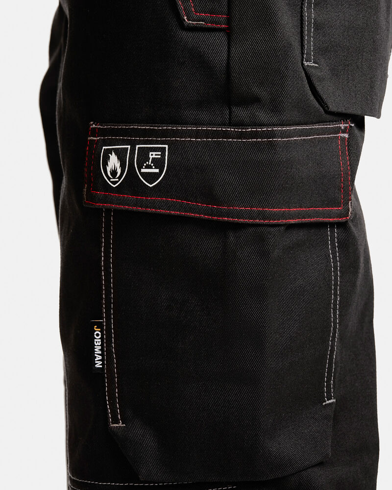 Jobmanin hitsaushousut on valmistettu 350 g/m²:n puuvillasta, joka on käsitelty palosuojatulla Probanilla. Tuote on sertifioitu EN11612- ja EN11611-standardien mukaisesti. Hitsausvaatemallisto on suunniteltu erityisesti hitsaajille ja muihin vaativiin työtehtäviin. Ulkopuoliset polvisuojataskut lisäävät mukavuutta ja kestävyyttä.