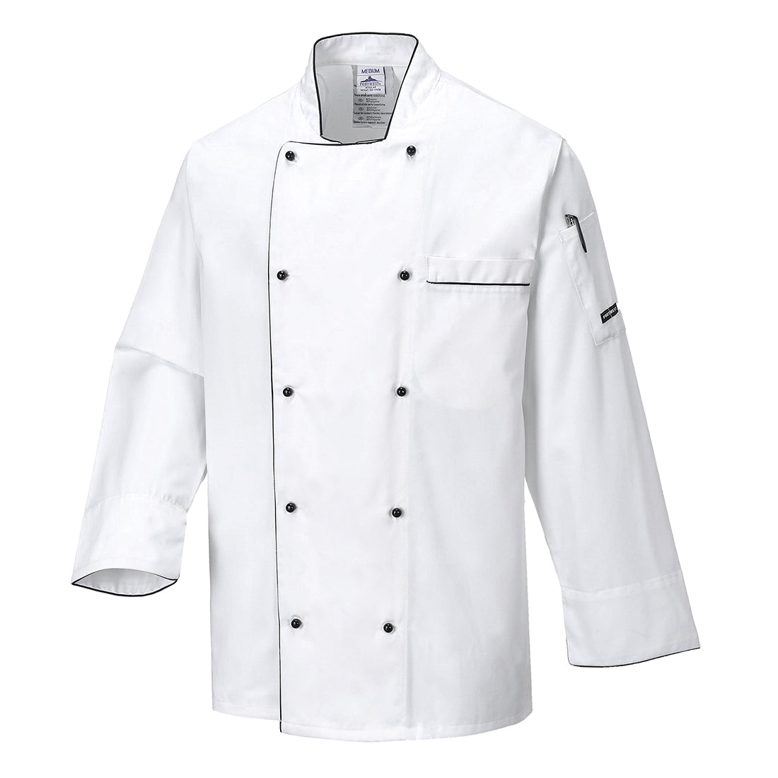 Kokintakki kestävää puuvilla-polyesterimateriaalia. Tummat viimeistellyt reunat ovat tyylikkäät ja malli on käytännöllinen elintarviketalouden, ravintola-alan ja pitopalvelualan töissä. Kainaloissa on tuuletusaukot ja edessä rintatasku.
