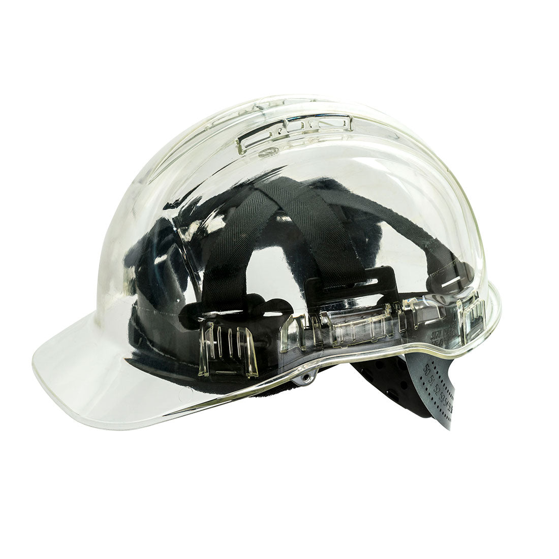 Portwestin patentoima malli. Suojakuori on läpinäkyvä, mikä mahdollistaa katsomisen ylöspäin lipan läpi. Erityisen vahva ja samalla kevyt polykarbonaatti-materiaali suojaa myös UV- säteilyltä.6 pisteen tekstiiliremmi pehmuste ja ilmastointiaukot kypärän yläosassa takaavat käyttömukavuuden.
